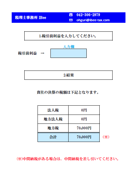 弊所では、資本金毎や会社の規模、利益を入力すると自動的に税額を算出する
