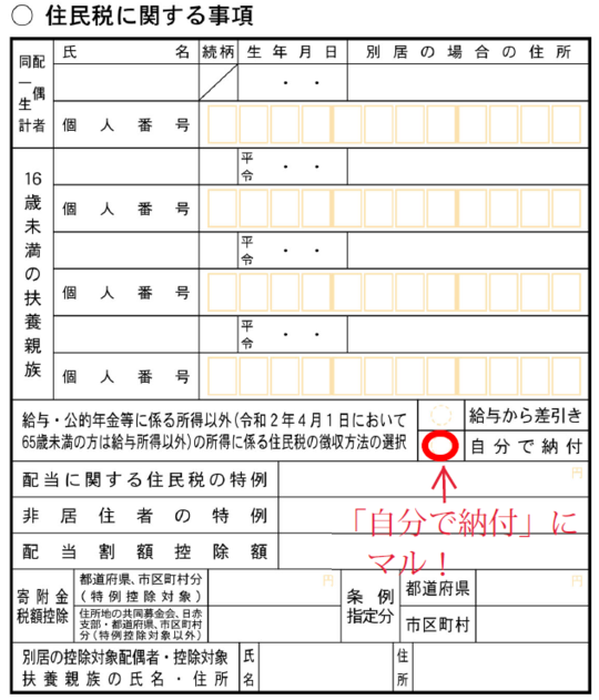 ここにマルをつければ副業分の住民税は自宅に届くようになり、