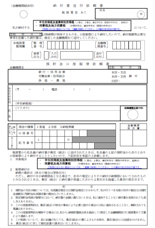 確定申告期限までに、振替納税依頼書を税務署に提出する必要があります。