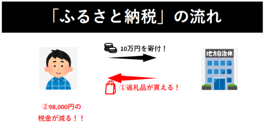 10万円を寄付して、98,000円分の税金が減り、返礼品が貰えます。