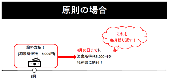 「源泉所得税」の納付は、原則給料支払月の翌月10日までに行います。