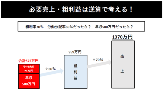 「575万円」÷「労働分配率60%」=「最低必要粗利益959万円」