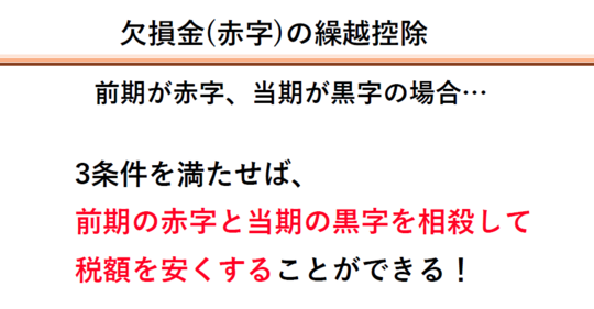 赤字の場合、繰越して来期以降の黒字と相殺し、来期の税金を安くすることができます。