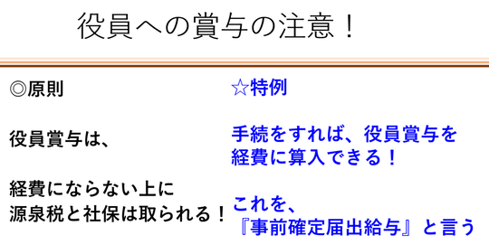 今回のコラムでは、役員賞与の原則の取り扱いと『事前確定届出給与』について解説しております。