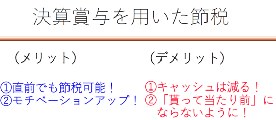 従業員に対して決算賞与を支給し、かつ当期の経費にすることで税金を減らす節税です。