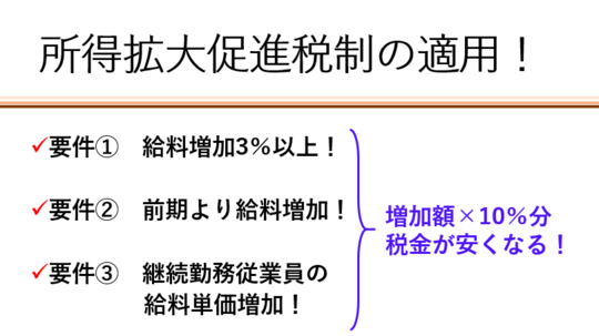 「所得拡大促進税制」は従業員にお給料を支払っている全ての会社について税額を安くする余地があります。