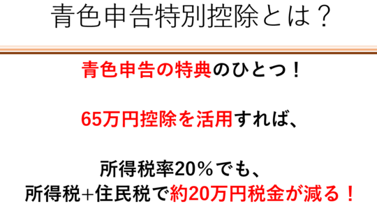 青色申告には「65万円控除」という最高のメリットがありますので、