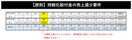 この「持続化給付金(原則)」は、2019年に設立した会社にとっては、